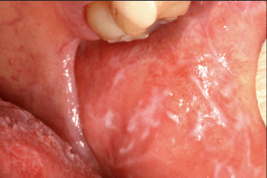 - White, lace-like patches – Known as “Wickham’s striae,” these patterns appear on the inner cheeks, tongue, or gums.